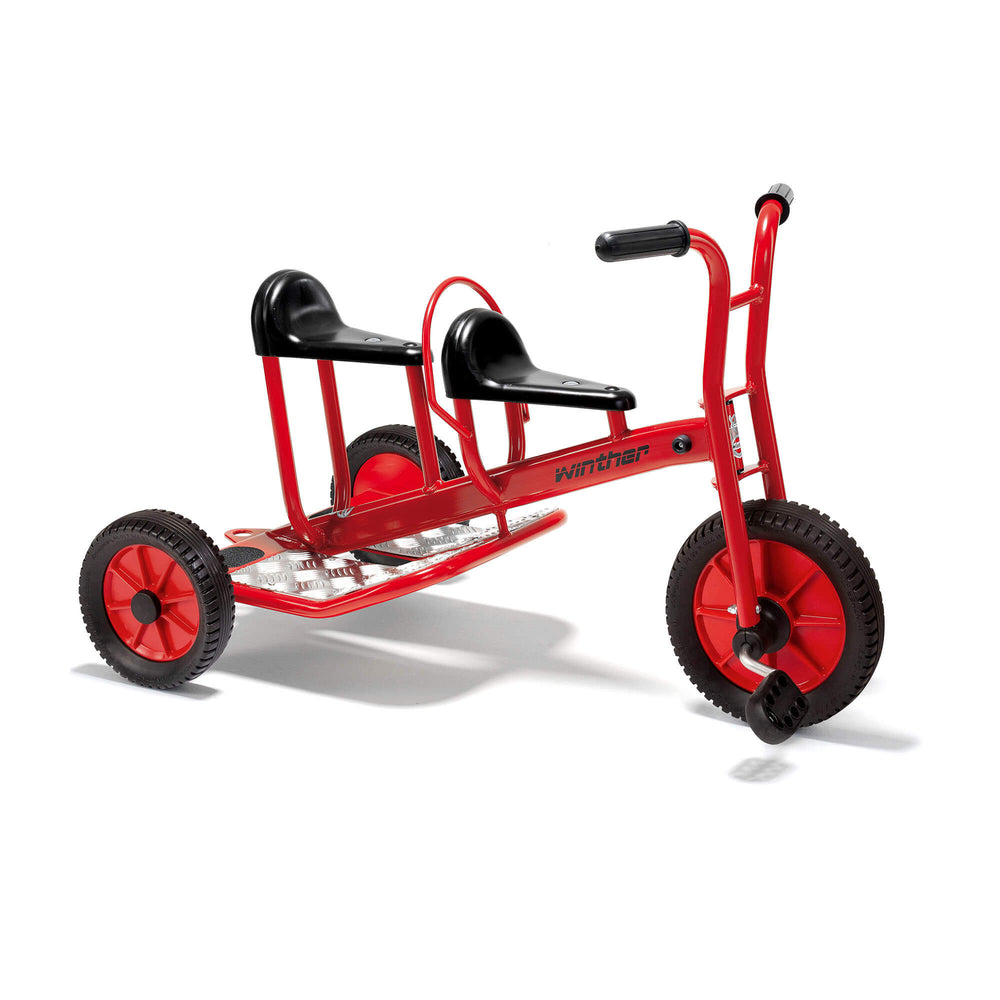 Winther's Viking range of heavy duty trikes have been thoughtfully designed to suit the needs of slightly older children. The Winther Viking Taxi is an extremely popular product that is ideal for use in all kinds of role-playing games. Room for a driver and a passenger. A safety bar provides extra security and attaching a trailer provides even more fun (available seperately). Effective rust protection and impact resistant powder coating. The designs have maximum safety built in and include non-slip pedals, rounded off edges and safety handlebar grips. 5 year warranty on frame and fork , Raw Materials: Manufactured from heavy duty steel and impact resistant powder coating that will last for many years. Solid puncture proof rubber wheels. Tough plastic seating. Tested to relevant safety standards., Dimension : 960 x 580 x 620 , Age range : Ages 4 to 7