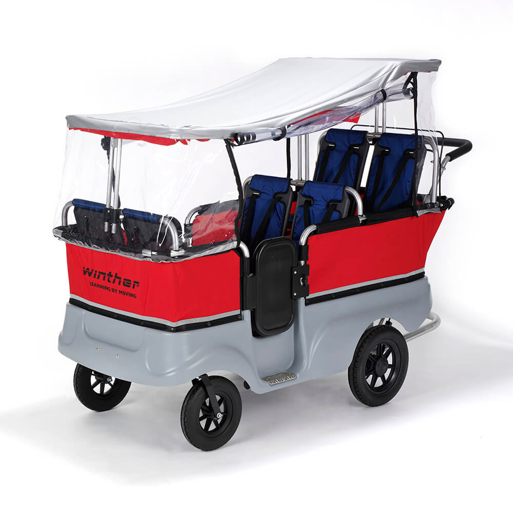 Don't let the weather ruin a perfect day out. This practical and durable rain cover is fitted over the Turtlebus in no time. To use the raincover you will also need to have x 3 of item 313.24 sun canopies. The bus must be equipped with canopies, as the raincover is to be mounted on top of these. It provides protection for light rain as well as driving rain from the sides, however, it is not completely waterproof, as it is necessary to have openings in certain places to ensure ventilation. , Raw Materials: Manufactured from clear plastic with velcro and zip fasteners, Dimension : For 6 seater standard Turtlebus , Age range : Ages 0 to 4