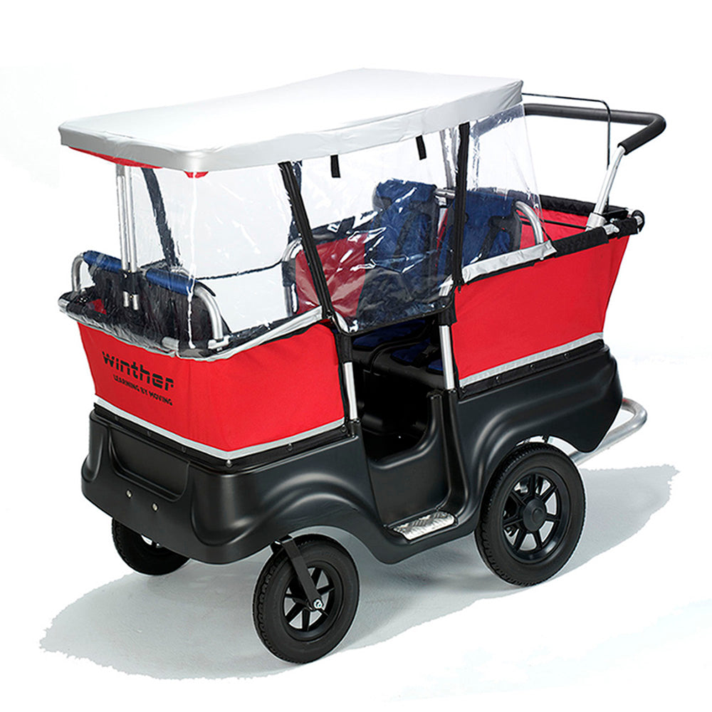 Don't let the weather ruin a perfect day out. This practical and durable rain cover is fitted over the Turtlebus in no time. To use the raincover you will also need to have x 2 of item 313.24 sun canopies. The bus must be equipped with canopies, as the raincover is to be mounted on top of these. It provides protection for light rain as well as driving rain from the sides, however, it is not completely waterproof, as it is necessary to have openings in certain places to ensure ventilation. , Raw Materials: Manufactured from clear plastic with velcro and zip fasteners, Dimension : For 4 seater basic Turtlebus , Age range : Ages 0 to 4