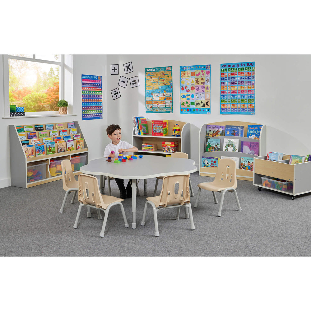 The Thrifty 6-seater flower table (ages 2 to 11) is supplied in cool grey and natural wood colours. Grey is a sophisticated and practical colour for your classroom environment. Tabletops are manufactured from hardwearing melamine faced engineered wood with a white PVC edging which is highly resistant to impact and abrasion helping to ensure long life.