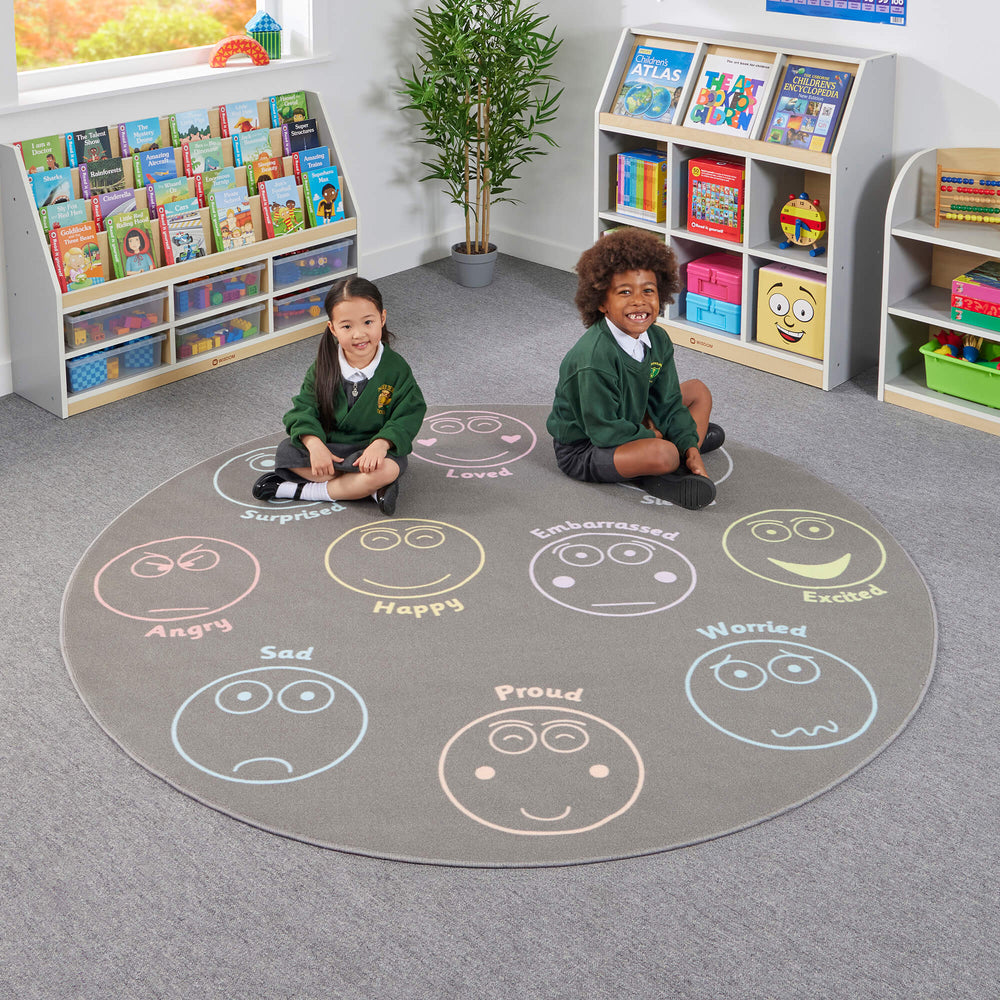Displaying 10 different emotions in muted pastel tones children will learn valuable social and emotional skills as they learn to confidently express themselves by standing or sitting on the emotion they are feeling. , Raw Materials: Manufactured from durable tightly woven nylon with a 3mm pile and latex anti-slip