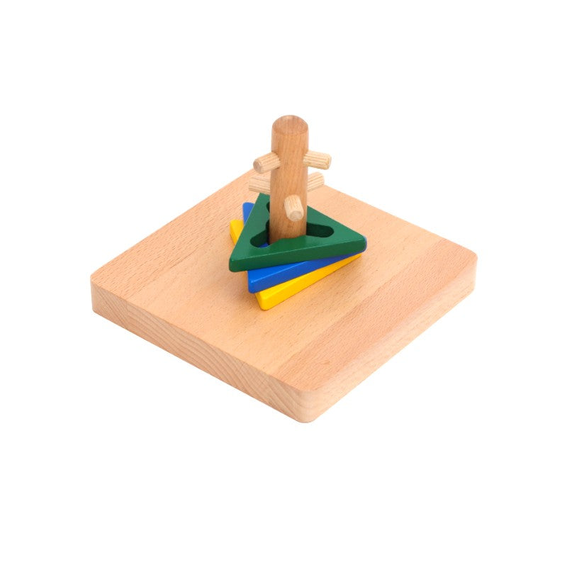It has 3 different colored triangle pieces and a base with two split sticks mounted on a vertical dowel.; Age 16 Months+