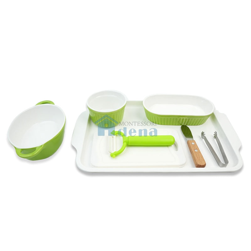 A glass holding bowl, a large plastic tray includes a long elliptical bowl, a round bowl, a peeler, a knife and a cutting board. a clip is included; Age 20 Months +