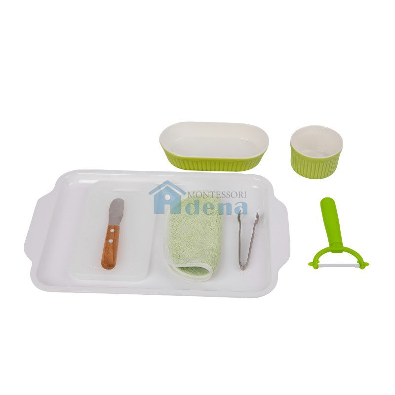 A glass holding bowl, a large plastic tray includes a long elliptical bowl,a round bowl, a peeler, a knife and a cutting board. a clip is included; Age 2.5-3 Years Old