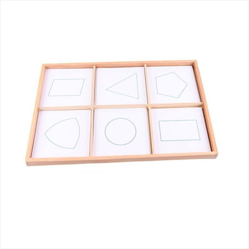 Three series of cards that correspond to the figures contained within the geometric demonstration tray. Each shape is represented by a thing outline, thick outline, and filled-in card. All cards contained in a compartment tray.; Age 3.5 Years Old+
