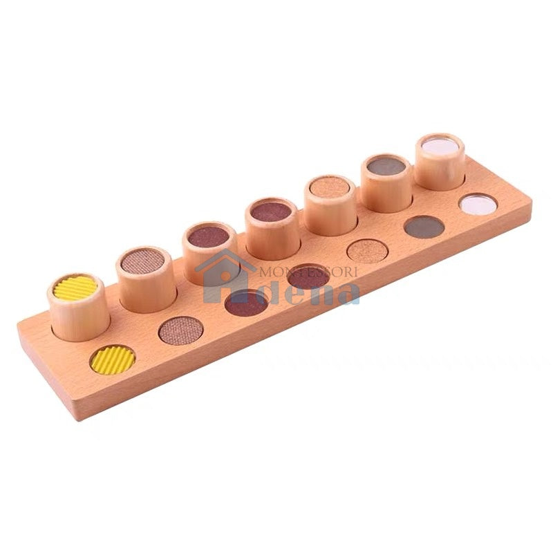 Six different tactile wooden cylinders are placed in the tray.; Age 3.5 Years Old