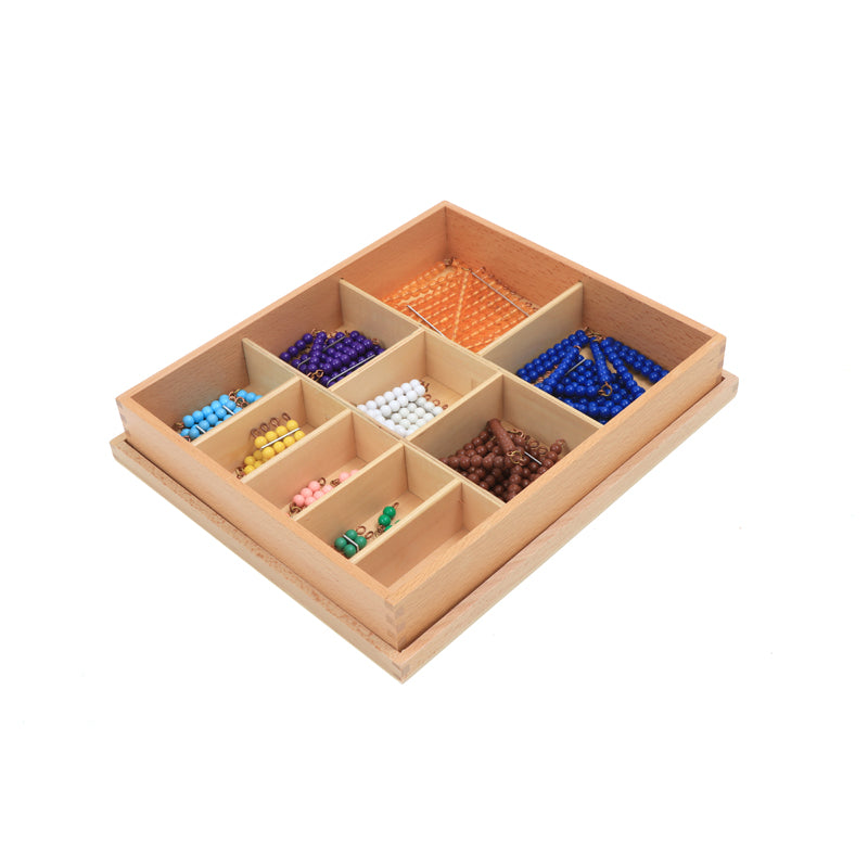 A wooden compartment box contains colored bead squares and chains.; Age 5 Years Old