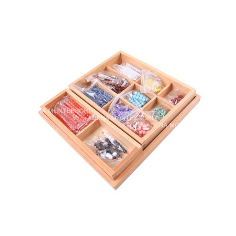 A wooden tray contains : 1) ten bars of each coloured bead bars 1-9 in a wooden compartment box; 2) black and white bead stairs 1-9, plus 20 golden bead bards of 10 in a wooden compartment box. This set is used for building teh decanomial. The entire multiplication table