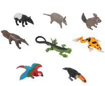an anteater, a poison dart frog, a toucan , a macaw, a green iguana, a tapir, a chinchilla, an armadillo; Age 3.5 Years Old+