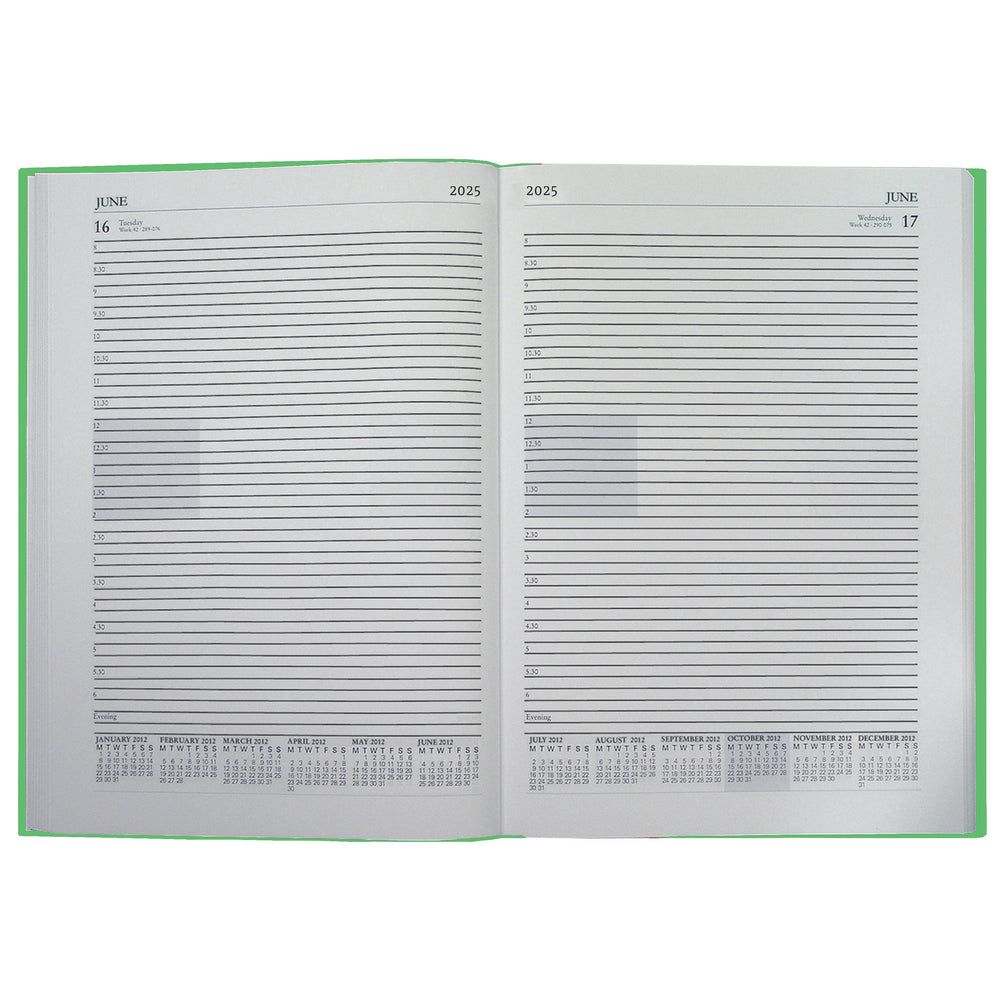 One day to a page. Hardback cover with appointment times. Year and ESPO logo added to front cover and spine. Approx. sizes - ESPO logo size 62 x 20mm, year size 35 x 10mm. Year at top right, ESPO logo at bottom right. 70gsm paper, ribbon marker. Current year planner in front cover pages and forward planner in back pages. Lime green cover.