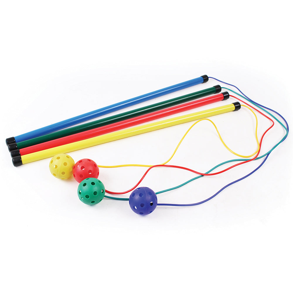Provides a popular variation to Skipping with an airflow ball attached by cord to a plastic stick. Supplied in mixed colours. Set of 4.