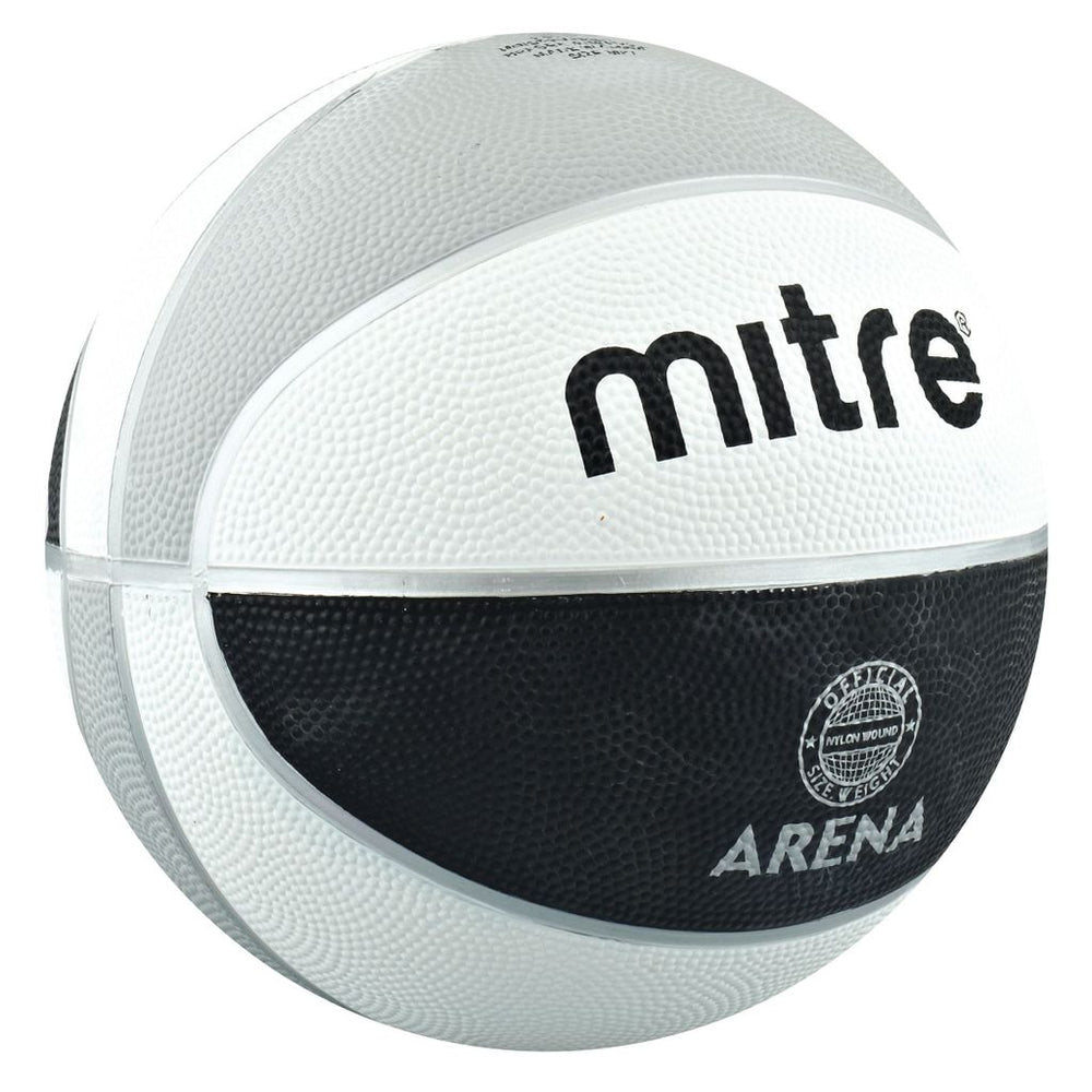 An eight panel rubber compound construction with a high air retention nylon wound bladder. Indoor/outdoor use. Colour black/silver/white.