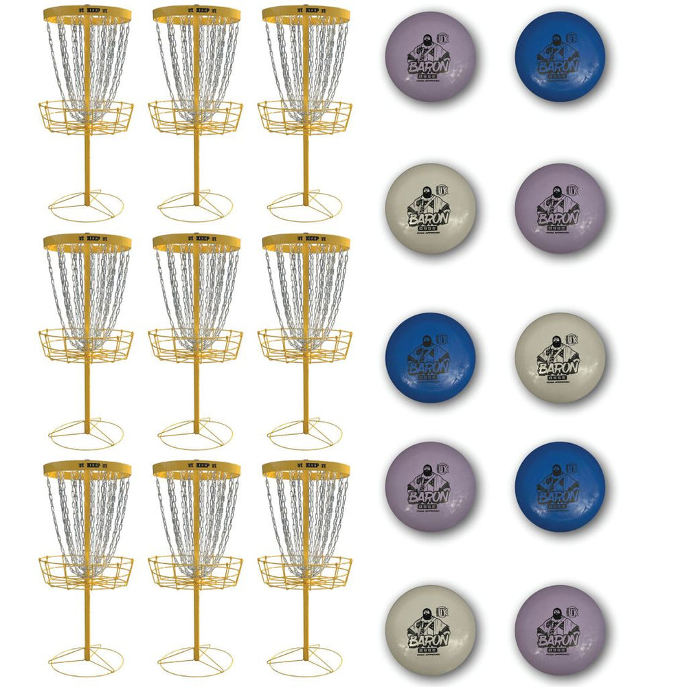 The UK’s first portable Disc Golf basket. The baskets are lightweight and packs down for easy transportation. Offered in 3 versions including either 3, 6 or 9 Keep baskets and all include 10 discs.