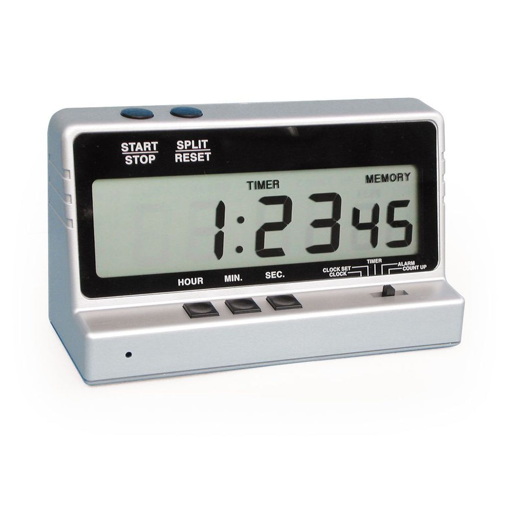A display clock featuring memory timer and clock with alarm. Counts up and down to 24 hours in hours, minutes and seconds and has an audible alarm at the end of the countdown. Includes a lamp facility on count up. Size: 16 L x 9 W x 7cm D.