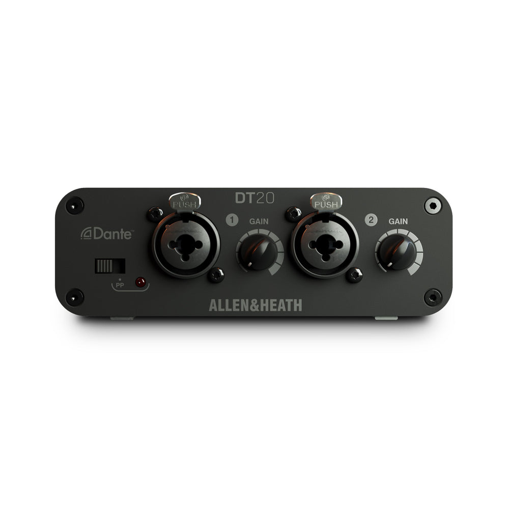 • Compact and cost effective 2in Dante interface • 96kHz Dante support • Pair of combi mic/line inputs with local gain control • +48V phantom power with LED indicator • DDM offers security, organization, scalability, and control • Interoperability with other AES67 devices on the same network, Introducing the Allen and Heath DT20 2in Dante interface The DT20 is a compact 48kHz/96kHz Dante interface enabling convenient placement of 2 mic/line inputs wherever you need to get analogue audio into a Dante network. It's ideal for both fixed installation and AV hire / live applications, and can be used with any Dante-equipped Allen & Heath mixer (such as the Avantis) or AHM system, as well as in third party Dante systems. The unit can be PoE powered or powered via a DC 12V supply. Surface mountable Thanks to its compact format, DT20 can be easily mounted under a table, podium etc. for local mic connection.