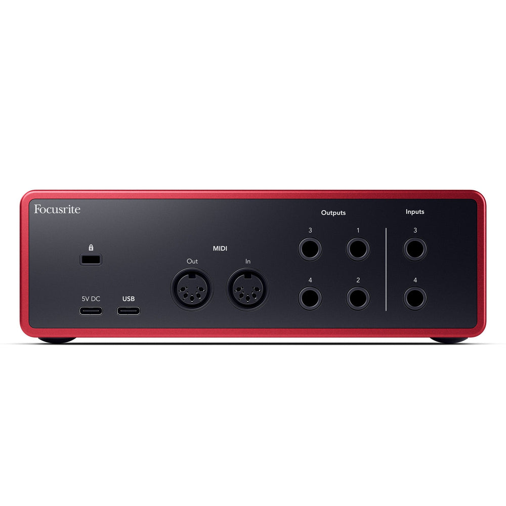 • Complete compact studio hub for all your instruments • Perfect for multi-instrumentalists and collaborators • Two ultra-detailed ultra-low-noise mic preamps • 69dB mic gain range and 120dB dynamic range • 2 instrument inputs, 4 line inputs • 4 line outputs and a headphone output, Introducing the Focusrite Scarlett 4i4 (4th Gen) audio interface Scarlett 4i4 is the complete compact studio hub for all your instruments. Perfect for multi-instrumentalists and collaborators, 4i4 is loaded with I/O for everything. Two of our most detailed ultra-low-noise mic preamps. Hi-Z, line and MIDI connections for your keys, guitars, synths, grooveboxes and controllers. With 4i4 your headphones, monitors, and line outs each get their own mix, so you can match the studio setup to the session. Air mode, with Presence and Harmonic Drive, gives you that big console sound wherever you record. Auto Gain and Clip Safe make sure you'll never need to worry about your levels. And the Hitmaker Expansion software bundle includes all the tools you need to record, produce and release your tracks. With its ultra-low-noise mic pres and studio-grade converters, this audio interface delivers professional-quality sound with a huge 120dB dynamic range. The 4i4 features two microphone preamp inputs and four high-quality line inputs - ideal for recording groups and multiple people at once. Perfect for musicians, podcasters and more The Focusrite Scarlett 4i4 4th Gen Audio Interface is a creative's dream studio. With its Hi-Z instrument inputs, you can plug your guitars/keyboards directly into the interface and experience the authentic amp feel. Connecting a microphone to the Scarlett 4i4's mic pres instantly delivers professional-quality sound. Wherever you choose to create your music, the Scarlett 4i4 ensures that Focusrite's renowned sound quality accompanies you. Not only is it suitable for studio-grade vocal/instrument recordings, the rich sound quality and onboard headphone output make it perfect for podcasters, content creators and livestreamers. Add some sparkle with Air Mode For standout lead vocal and instrument tracks, the Scarlett 4i4's re-engineered Air mode elevates your sound's unique character. Modelled after classic consoles found in top-tier studios, Air mode adds a musical presence and rich harmonic drive to your recordings. With Air mode, your music will always take centre stage in the mix. Set and forget Setting levels is made quick and effortless with the Scarlett 4i4's Dynamic Gain Halos. These intuitive LED rings help you achieve the perfect recording levels every time. Say goodbye to guesswork and hello to great recordings with reliable level guidance. Stunning 192kHz/24-bit sound quality The Scarlett 4i4 ensures that every detail of your recordings is captured with precision. Boasting 192kHz, 24-bit converters, which are the same as those used in Focusrite's flagship RedNet interfaces, this audio interface guarantees exceptional sound quality. Now you can squeeze every drop of detail from your recordings without any compromise. Monitor your sounds with the headphone output With its custom-designed headphone amp and wide dynamic range, the Scarlett 4i4 provides the best playback you've ever experienced. The interface drives high impedance headphones with improved clarity and volume. Furthermore, the 4th Generation 4i4 features independent controls for headphones and monitors, giving you complete control over your audio playback while recording, mixing, or playing back your music. Loopback functionality - capture your computer's internal sound All the software you need What's in the box? - Scarlett 4i4 audio interface The Scarlett 4i4 makes creating your own samples a breeze with its Loopback feature. You can now send stereo audio from music apps and other software directly to your Digital Audio Workstation (DAW) using 4i4's virtual inputs. Say goodbye to the hassle of importing samples and enjoy a straightforward workflow. Not only is this great for creating your own samples or recording samples from your favourite websites; but it can also be used to incorporate background music during live-streams and podcasts. Once you've got started with Ableton Live Lite, three months of Pro Tools Artist, or six months of FL Studio Producer Edition recording software (all included), the Hitmaker Expansion bundle has everything you need to bring big studio sound to your songs, with an unbeatable range of record-making studio tools from the biggest names in the business. Discover the Hitmaker Expansion here. - 1m USB-C to USB-C cable - USB-C to USB-A adaptor - External power supply Our Focusrite Scarlett 4th Gen audio interfaces - Focusrite Scarlett Solo (4th Gen) audio interface - Focusrite Scarlett 2i2 (4th Gen) audio interface - Focusrite Scarlett Solo (4th Gen) studio pack - Focusrite Scarlett 4i4 (4th Gen) audio interface - Focusrite Scarlett 16i16 (4th Gen) audio interface - Focusrite Scarlett 18i16 (4th Gen) audio interface - Focusrite Scarlett 18i20 (4th Gen) audio interface