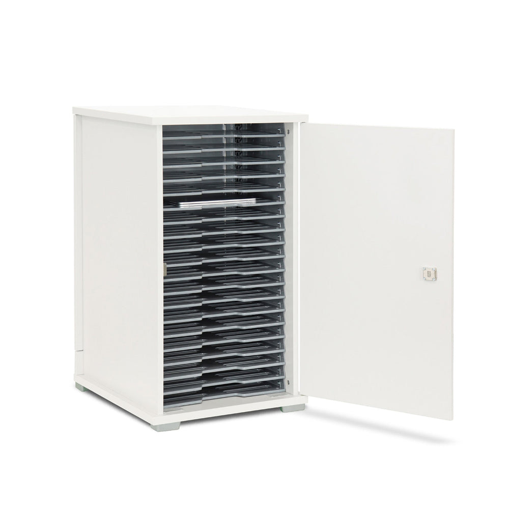 • Charges laptops, Chromebooks or tablets up to 15.6", including protective cases • Smart cable management with secure clips and flexible AC adaptor pockets • Simultaneous fast charging via AC power strips with surge protection • Silent passive ventilation system with no noisy fans • Heavy-duty locking system and separate lockable power compartment • Shipped fully assembled with a lifetime manufacturer warranty (5-year electrical warranty), Introducing the LapCabby Lyte single door AC charging cabinet The LapCabby Lyte single door plastic shelf charging cabinets offer a secure, efficient, and space-saving solution for charging and storing up to 16 or 20 devices with screens up to 15.6", including laptops, Chromebooks, tablets, POS systems, and other chargeable equipment. Perfect for education, studio, and commercial spaces, these robust units provide efficient simultaneous charging, silent ventilation, and advanced security within a durable, compact design. The unit has a Lifetime Warranty (5 years electrical), and is shipped fully assembled, making it a practical, long-term solution. Equipped with two in-house designed power strips, either 8-way (Lyte 16) or 10-way (Lyte 20), these units allow for simultaneous charging of all devices. Angled sockets accommodate larger adaptors side by side without blocking adjacent outlets. A 1.8m (6ft) IEC power cord is included, and a soft-start power management system protects devices with in-rush surge protection, sequential start-up, and residual current protection. Organised, protective storage Devices are stored horizontally in individual compartments, with room for protective cases and other tech accessories. A fixed-shelf layout ensures devices remain safe during storage and allows for easy, tangle-free access. With models supporting 16 or 20 compartments, each device is well-protected in a clean, efficient configuration. Reliable built-in security Security is LapCabby’s top priority. Each cabinet features a 6-plate lever activation key lock system and a separate, lockable power compartment to secure both devices and internal electrical components. Inset door handles eliminate protruding parts, reducing damage and enhancing safety. Plus, the clean, impact-resistant design ensures long-term durability, even in high-traffic environments. Silent, fan-free ventilation system Ventilation is managed through a silent, fan-free design with side and rear vents that maintain consistent airflow to prevent overheating, without the noise or risks of traditional fans. This makes the unit ideal for quiet, hygienic environments such as classrooms, offices, and medical settings. Advanced cable and adaptor management Each AC adaptor is stored in its own flexible ABS pocket within the power compartment, keeping cables organised, secure, and free from damage. Cable clip channels route power leads from the rear to each front device compartment, locking cables in place to prevent them from being pulled out when removing a device. Ready to use and built to last The Lyte 16 and 20 models are built from high-density plastic and tested to commercial-grade furniture standards, ensuring durability and stability even in high-impact environments. Weight-bearing L-shaped feet provide airflow underneath for easy cleaning, and a rear overhang allows the unit to sit flush against the wall without obstructing ventilation. Each cabinet ships fully assembled for quick deployment. The units are also UL safety tested, CE & UKCA compliant, and tested to meet healthcare infection control procedures for thorough cleaning. The LapCabby lifetime warranty The LapCabby Lifetime Warranty All LapCabby products include a comprehensive Lifetime Warranty with 5 years of electrical cover and 3 month consumable (USB charging cables etc.) cover too. The lifetime warranty provides fantastic assurance to schools and offices looking to make a safe, long-term investment in their technological equipment. For more information about the warranty or to claim, visit LapCabby's website here.