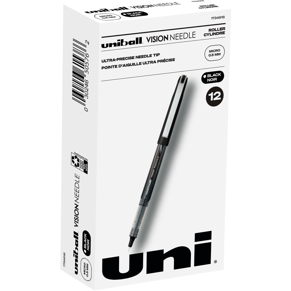uniball Vision Needle Stick Pen, 0.5 mm, Black Ink/Barrel, Pack of 12