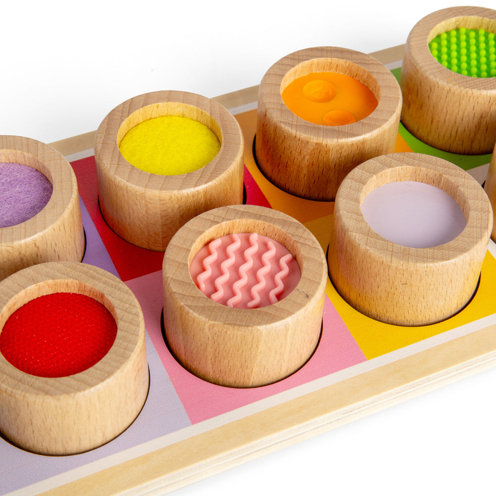 Tots can explore new patterns and textures with this eye-catching rainbow Sensory Board. The set comes with a wooden colour-match tray and 10 small tubes offering different sights and feels, such as rippled silicone, felt, a mirror and more!This Sensory Board is a fun way to show babies and toddlers the difference between smooth and bumpy textures. Alongside sensory play, the tubes can be slotted into the spaces on the coloured tray, which is great for developing young children's dexterity and colour recognition.Made from sustainably sourced FSC® Certified wood and coloured with non-toxic paints and lacquers. Conforms to current European safety standards. 30cm H x 25.5cm W x 11.4cm D. Suitable for 12+ months.10 play pieces featuring different textures
